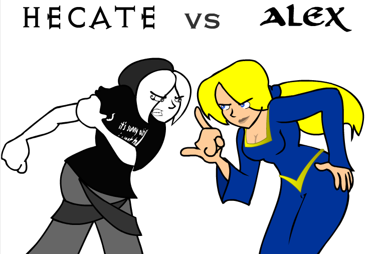 Chris, wanting to draw something to get himself back into Jaks Tales, came up with this pic of a showdown between Hecate (one of his characters) and Alex. Why, you ask? Why not, I say!