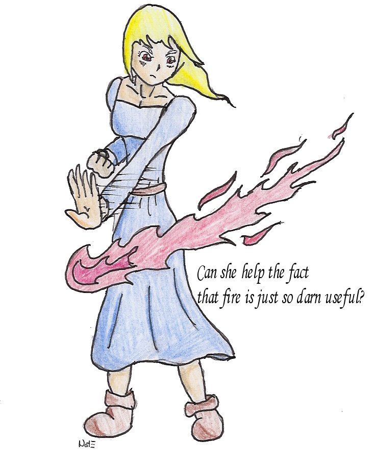All of a sudden, Nate Dubya from the Forum came forward with a couple bits of rather cool fanart for me. And hey, complete with odd quotes, too! As you can see, he pays attention to the BanterBits. You can do so much with fire!