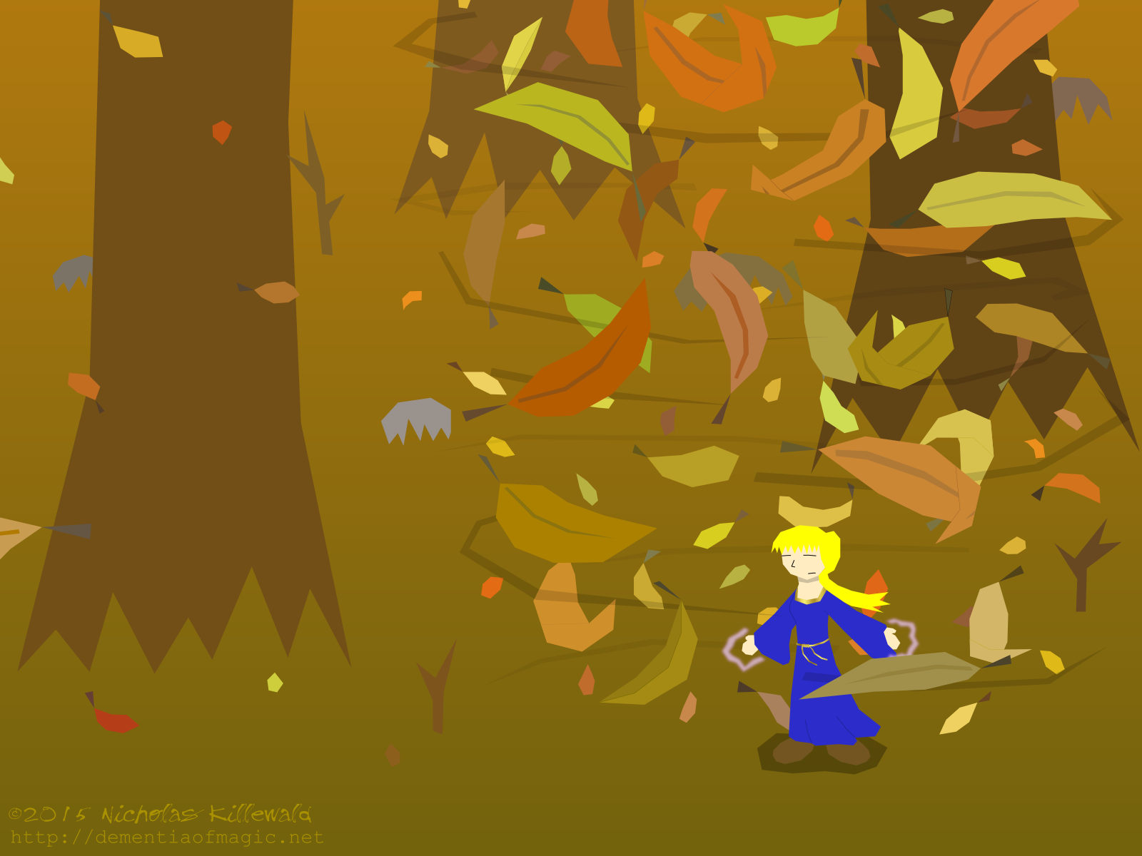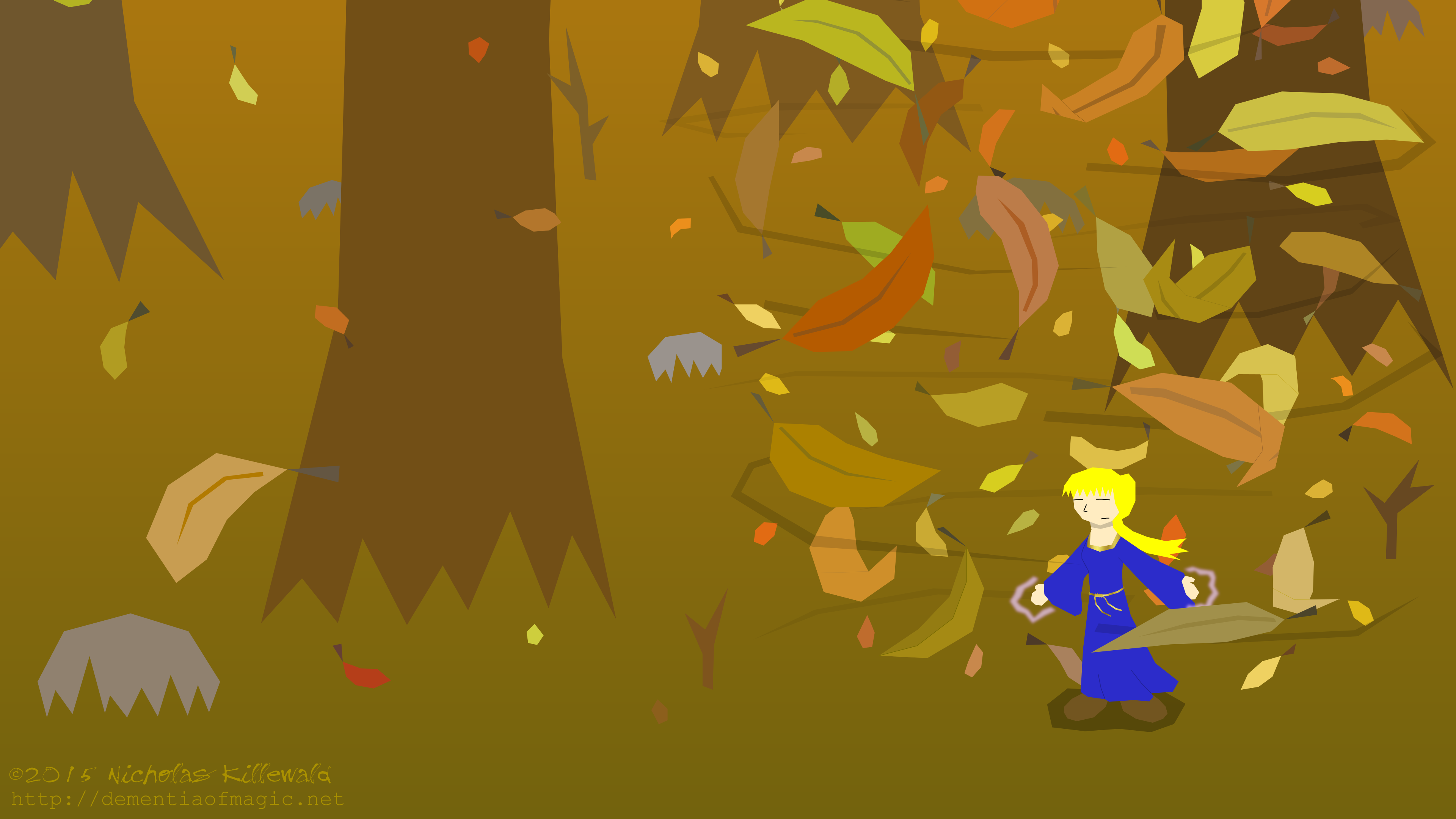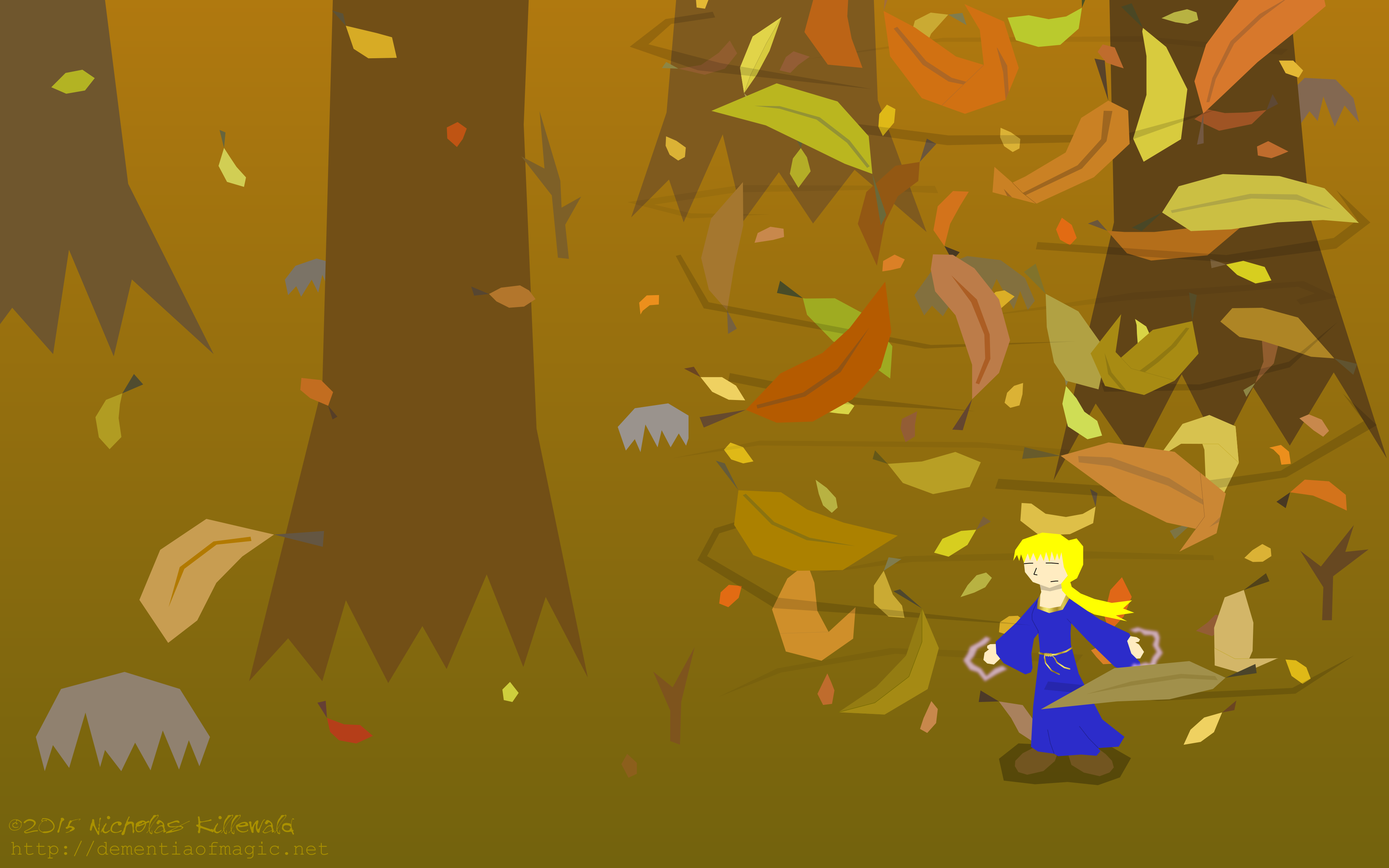 Remember that old vector-based beach elf wallpaper I made a few years back? The one with the pointy lines and stylized edges with which I can make neat new sizes at will? Looking it over, it worked out well as a DoM wallpaper representative of "summer", so I had the idea to finish up the other seasons in a similar vectoriffic style. So, enjoy the muted colors of autumn with Alex's efforts at minor landscaping!