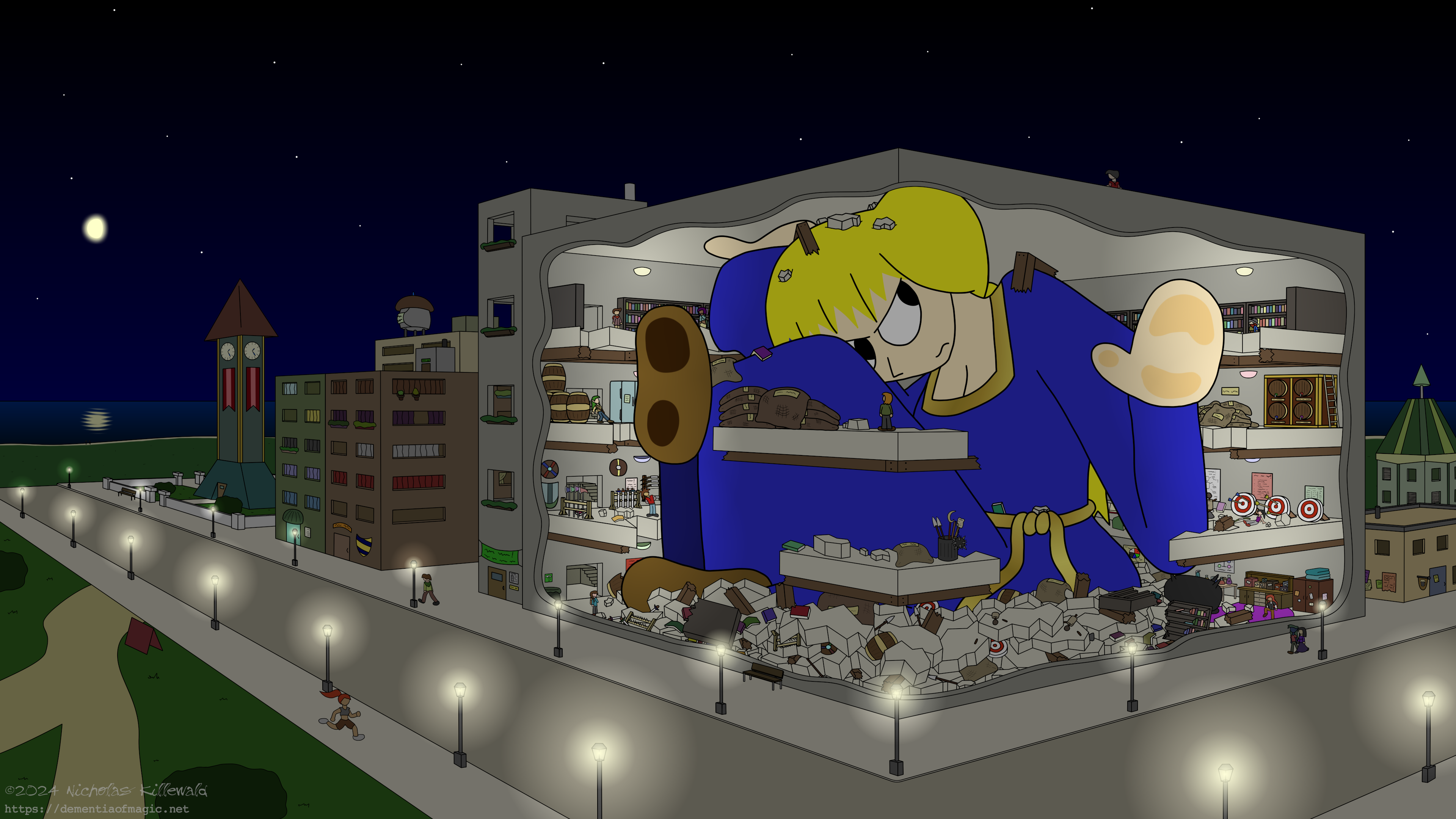 One day, I decided I wanted to try drawing character poses I don't draw very often. Hence, this pose of Alex stuck in a box. And then I started having fun until it kinda evolved from there to add in the building around her, and then a bunch of rubble, and then the rest of a city, and then more and more details, and eventually it turned into this wallpaper!