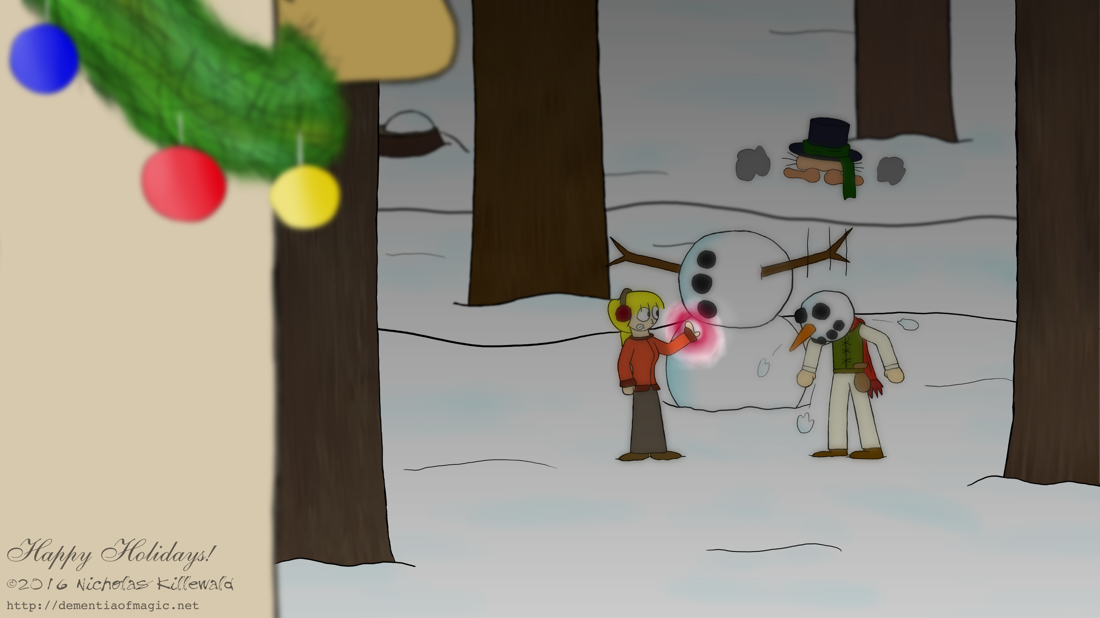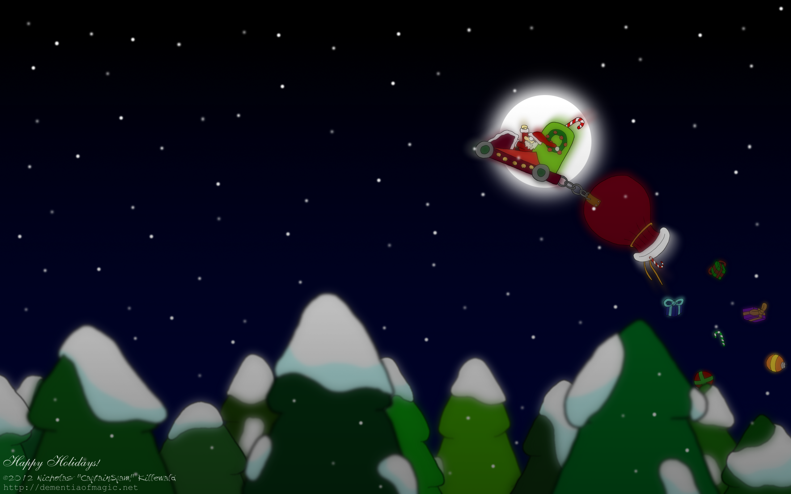 It's been another four years, hasn't it? Well, why not celebrate the holidays with our favorite jolly old dwarf, Cesol, as he rides his steam cart through the night sky, haphazardly distributing holiday cheer to... oh... let's say the people who live under his flight path. Hopefully. Happy holidays! Here's hoping it won't be another four years until the next one!