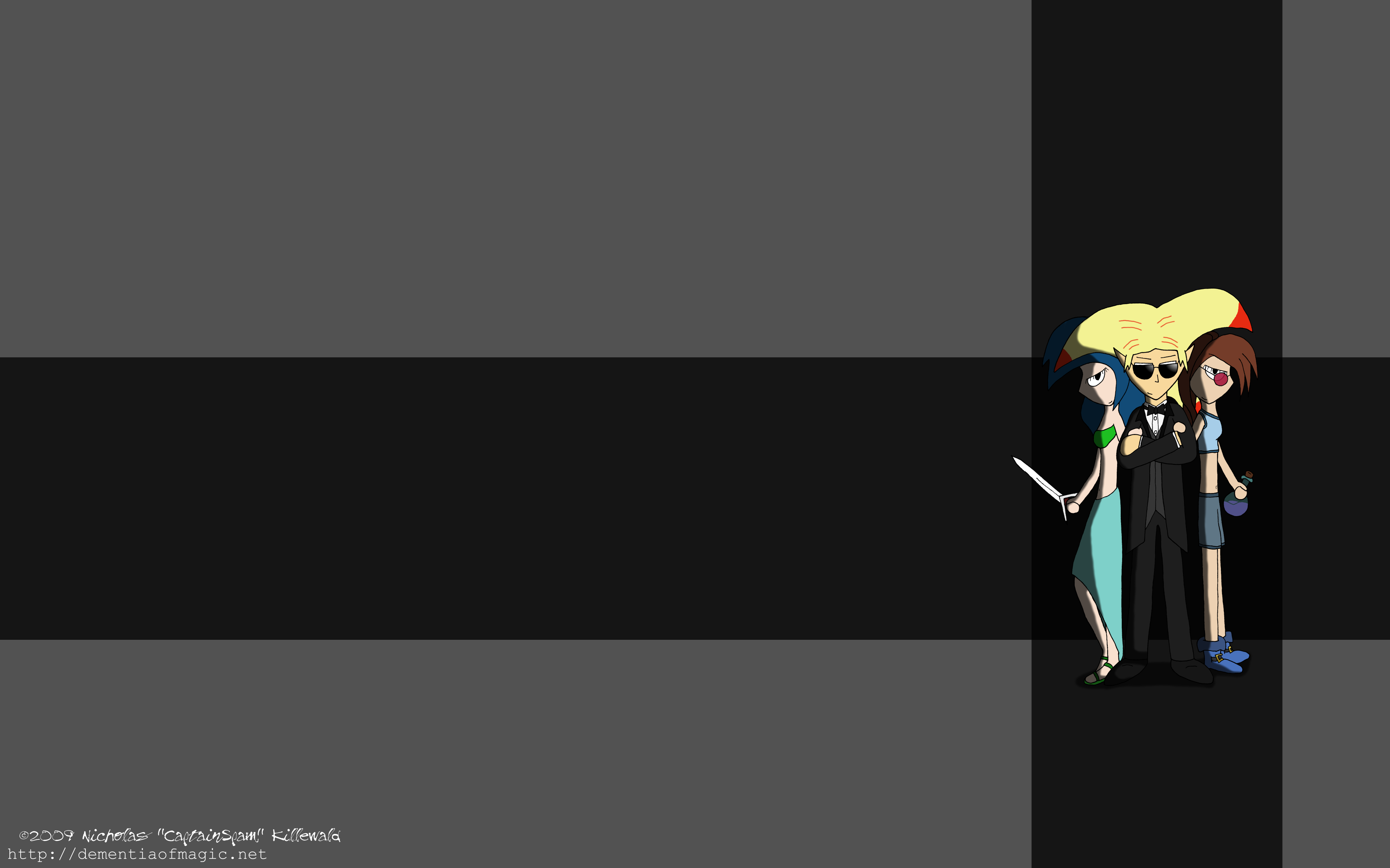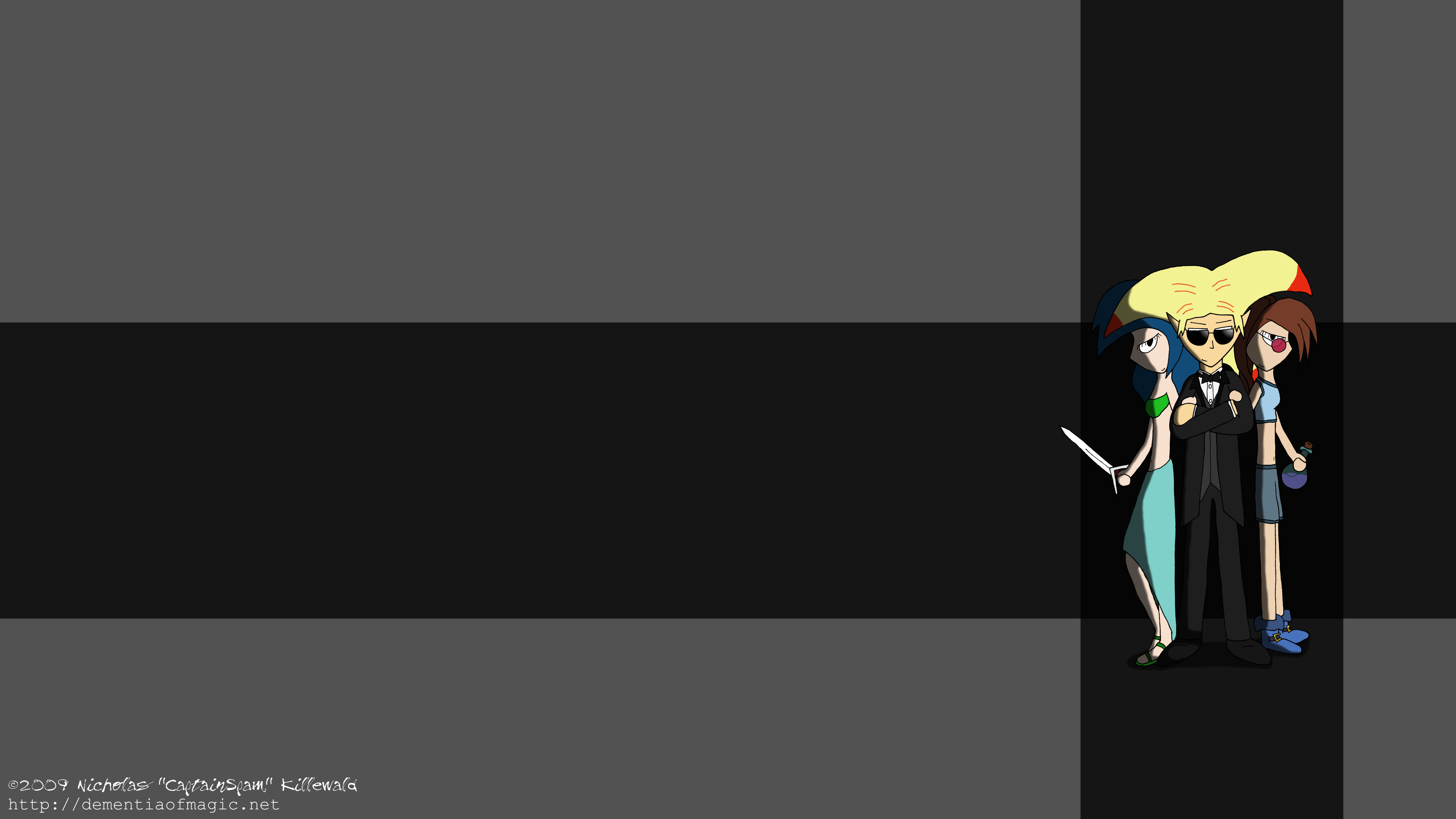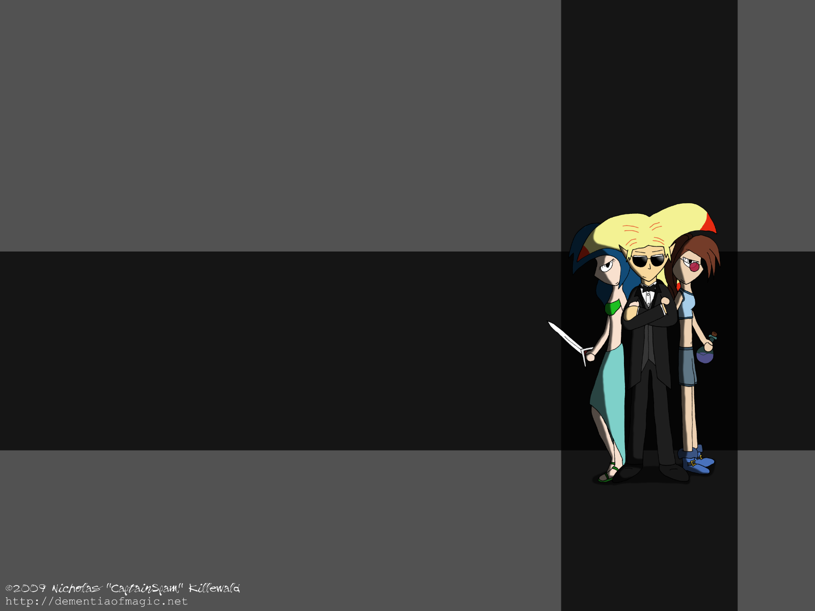 I suddenly had the bright idea to make wallpapers for the short stories in Chapter Four. So here's the first: Cy with two of the ladies. In a sort of cross between James Bond and Charlie's Angels.